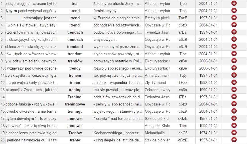 Note: This feature only works for words. The words can be lemmatized – e.g. “<lemma=stracić>|<lemma=zgubić> portfel” – but the concordancer is not able to find be multi-word strings. For instance, “idzie zima|idzie wiosna” will NOT fetch the examples of “idzie zima” and “idzie wiosna” – instead the concordancer will be looking for “idzie zima wiosna” or “idzie idzie wiosna”. Neither of those phrases can be found in the corpus.